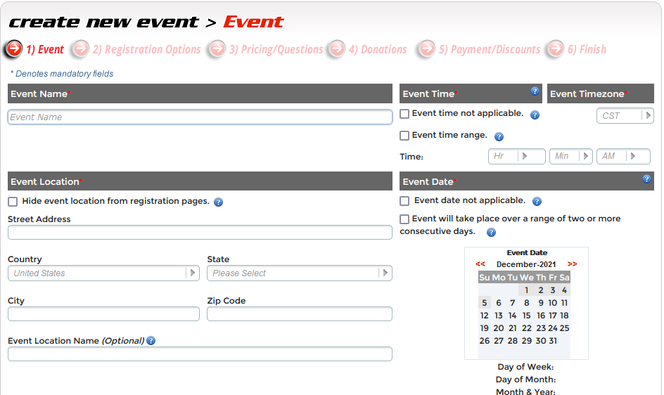 Step 2 - Login to your event director account and click on create new event, proceed to the first step of the event creation process if the page does not automatically load.