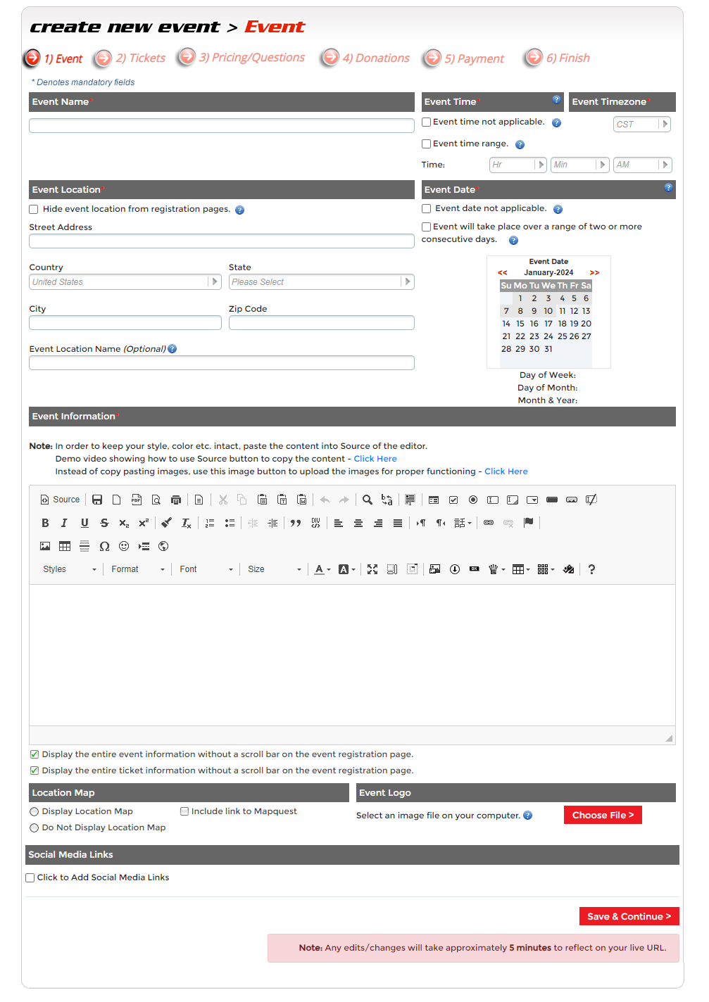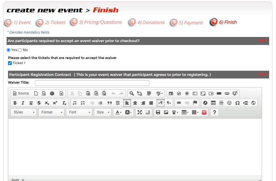Step 6 - Finish. This is the last step to having your event ready to accept signups. This final step is where you can upload event waivers, contact information, access your unique registration Link (URL), and publish event to live.